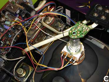 Finally, drill two holes in the simulated wood grain, and attach the switch, and audio jack to the holes. Now, plug it in, and crank up the tunes. |