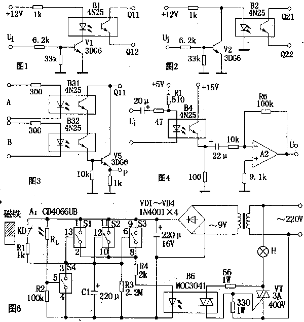 电路如图4所示.这是一个典型的交流耦合放大电路.适当选取发光回路限流电阻Rl,使B4的电流传输比为一常数,即可保证该电路的线性放大作用。