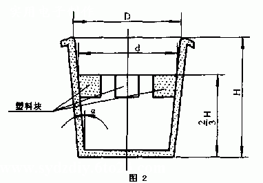 (2)用环氧树脂胶(或三氯甲烷)把六个塑料块粘到桶内壁且距桶底2/3高度处,尽量使塑料块上表面在同一高主度并处于同一平面内 如图2所示