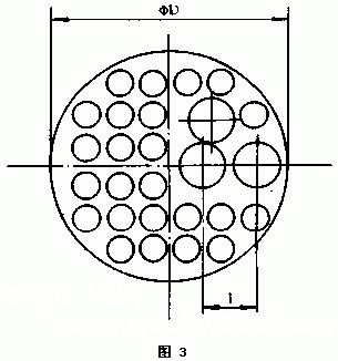 (3)把5mm厚、400mm×400mm塑料板加工成图3圆盘形状,半径与桶的三分之二高度处内径相当;小孔直径为3mm,相邻孔中心距为lmm;另外两个大孔直径与抽水泵的进出水管外径相当,间距也与进出水管相同;还有一孔用来放入加热器,孔径大于加热器外径2mm。