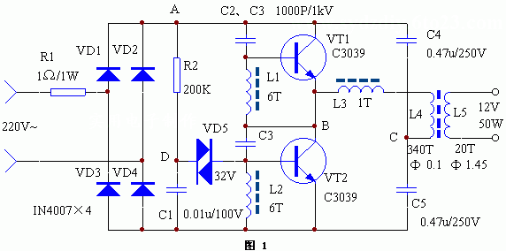 本电子变压器工作原理与开关电源相似,电路原理图见图1(点击下载原理图),由VD1-VD4将市电整流为直流,再把直流变成几十千赫兹的 高频电流,然后用铁氧休变压器对高频、高压脉冲降压。图中R2、C1、VD5为启动触发电路。C2、C3、L1、L2、L3、VT1、VT2构成高频振荡部分。