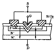 众所周知,传统的MOS场效应管的栅极、源极和漏极大大致处于同一水平面的芯片上,其工作电流基本上是沿水平方向流动。VMOS管则不同,从左下图上可以看出其两大结构特点:第一,金属栅极采用V型槽结构;第二,具有垂直导电性。由于漏极是从芯片的背面引出,所以ID不是沿芯片水平流动,而是自重掺杂N+区(源极S)出发,经过P沟道流入轻掺杂N-漂移区,最后垂直向下到达漏极D。电流方向如图中箭头所示,因为流通截面积增大,所以能通过大电流。由于在栅极与芯片之间有二氧化硅绝缘层,因此它仍属于绝缘栅型MOS场效应管。