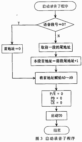 每个信息段的录放音时间等于总时间除以600。如ISD2560的总时间为60s,则每个信息段的录放音时间为100ms;ISD25120的总时间为120s,则每个信息段的时间为200ms。因此可以利用该时间长度作为一个段地址,通过单片机定时器的计时平行地映射信息段的地址,从而得到每段录音的起始地址。这样,就需要设置一个地址计数器。一般录音从0地址开始,首先通过CPU将它赋给A0~A9,然后通过单片机控制ISD启动录音,同时启动单片机的定时器开始计时,每到一个信息段的时间,就给地址计数加1。当单片机停止控制ISD录音时,同时停止定时器计时。此时地址计数器的值即为该段语音的未地址,加1即为下一段语音的首地址,并将它存在EEPROM中,为下一将放音提供的地址信息。通过CPU将该地址赋给A0~A9,即可录制下一段语音。依次下去,即可在录制完所有语音段的同时得到各段的起始地址。如果不是从0地址开始的语音段,只需将初始地址赋给A0~A9,加上地址计数器的值,即可得到语音段的末地址。这里不用同时保存各语音段的起始地址和结束地址,因为各个段是相邻的,前一段的末地址加1即是本段的起始地址,且每个语音段的结尾均有EOM标志,并可发出中断。放音时利用它和保存在EEPROM中各语音段的起始地址即可按任意顺序组合各个语音段。