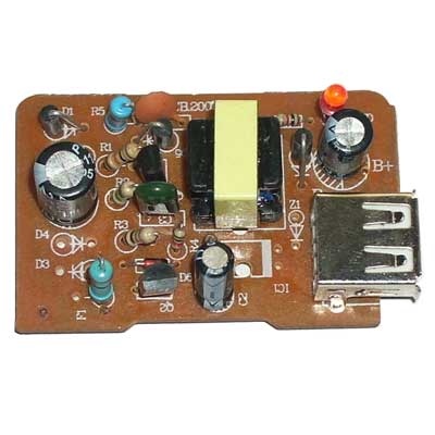 仔细检查线路板安装无误后,要通电试板时,可以在PCB板直接焊一个220V插头线,为了安全起见,请大家先在电源串联一个10W的白炽灯泡,以防止短路或者接错,千万注意安全,还有,元件一不小心就烧坏了,烧坏了需要再买才行。如果安装无误,用万用表可以测得USB 1脚和4脚应有5V的电压输出,电源指示灯亮,确认电路板装配无误。