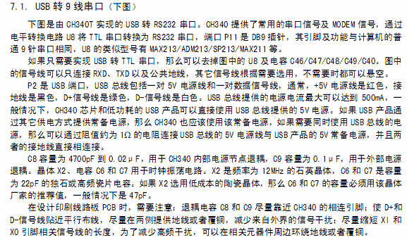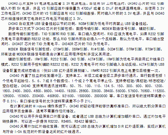 在串口方式下,CH340 提供常用的MODEM联络信号,用于为计算机扩展异步串口,或者将普通的串口设备直接升级到USB 总线。有关USB 转打印口的说明请参考手册(二)CH340DS2。
