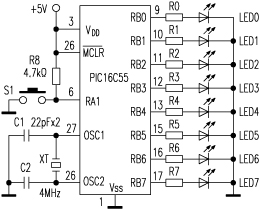 说明:在MPLAB集成开发环境下建立源程序时,其源程序文件的开始应使用伪指令List(列表选择指令)指示符,指定处理的类型(对象)。所以,上述的源程序的开始处为List P=16C55。其中的“P=”是处理类型,代表设置微控制器为16C55(芯片)。接着又用了伪指令#include P16C5XINC,代表MPLAB应把要处理(类型)的微控器F16C55的所有已设置的文件,在需要时就读入这里的源程序中。这条伪指令就为源程序中的代码设置大为简化,例如PORTB、TRIS以及其它特殊功能寄存器,就不再用EQU伪指令给它们赋值了。